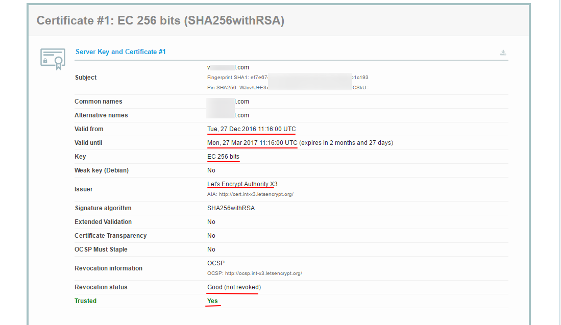 这是关于证书的信息。从图中可以看出,我的这个证书有效期是从 2016 年 12 月 27 号到 2017 年的 3 月 27 号,密钥是 256 位的 ECC,证书签发机构是 Let's Encrypt,重要的是最后一行,Trusted 为 Yes,表明我这个证书可信。